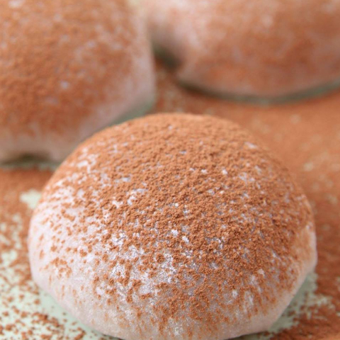 6.クッキーの上に(4)のチョコクリームをスプーンでのせる。求肥をかぶせて包む。ココアパウダーを振りかけたら、完成!