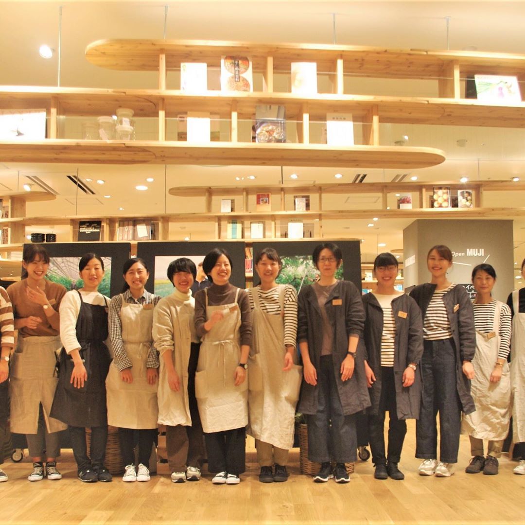 無印良品 京都山科 のスタッフは、働くときにエプロンをつけます。キッチンで家事をするお母さんのエプロン姿が不思議と素敵に見えるのと同じように、感じ良い空間を私たち自身でつくるお店にできたら、と思うからです。