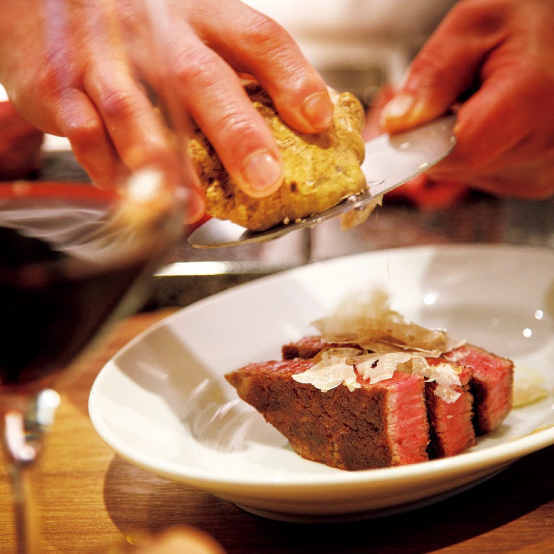 白トリュフたっぷりの松阪牛シャトーブリアンのステーキでボルテージは最高潮に。