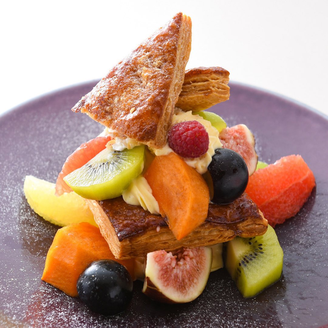 季節の果実をたっぷり贅沢に使用したミルフィーユは、同店の大人気メニュー!表面をキャラメリゼしたさっくりと軽いパイ、瑞々しい果実、程よい甘さのクリームが絶妙にマッチする。