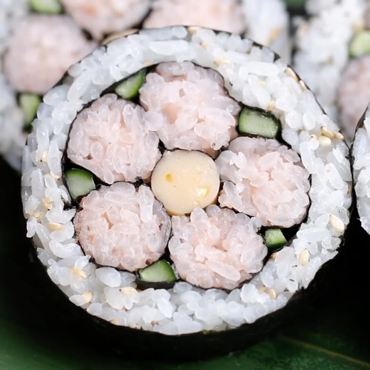 7.1/2等分にカットしたのりにごまを混ぜた酢飯をのせる。(1)をのせて巻き簾で巻き、好みのサイズに切り分けたら、完成!