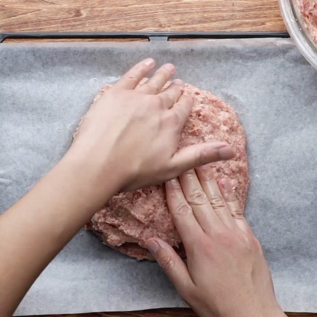 5.天板にクッキングシートを広げる。手にサラダ油(分量外)をつけ、(4)を数回に分けて手に取り、直径20~25cm大の円盤状に成形する。中心にカマンベールをのせ、上からも残りの肉だねをのせて形を整える。