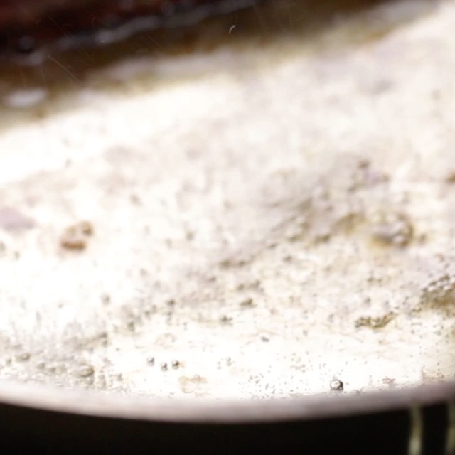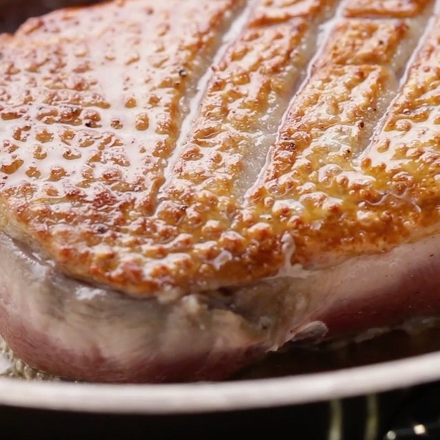 4. 冷たいフライパンに(2)を皮目を下にして並べ、中火で12-15分ほど焼く。うら返して1分焼いたら、再度皮目を下にして、200℃のオーブンで4分焼く(ミディアムレア。ミディアムに仕上げるには6分焼く)。