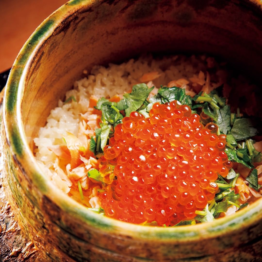 鮭といくらの親子ごはん。中川一辺陶の土鍋で炊き上げた、鮭のマイルドな塩味といくらの濃厚な味わい⠀⠀⠀⠀⠀⠀⠀⠀⠀