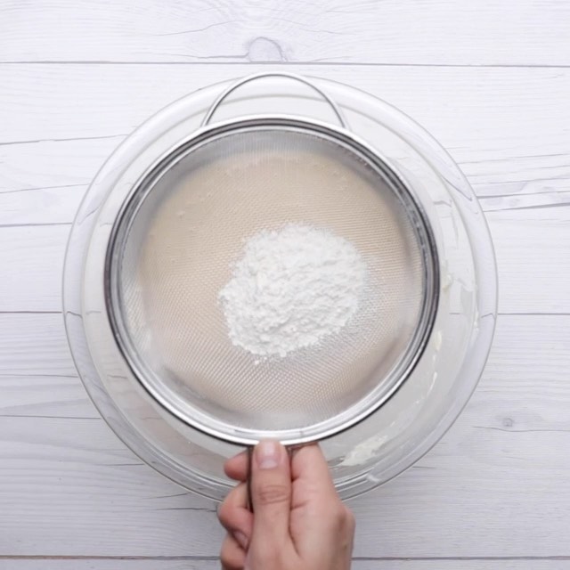 4.卵、生クリームを加えて混ぜ、薄力粉を振るい入れ、ダマがなくなるまで混ぜる。