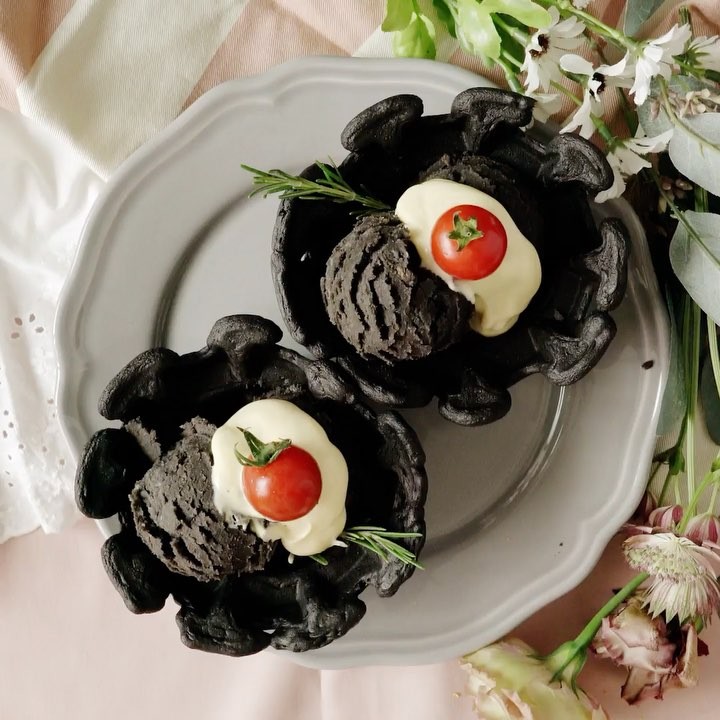 3. アイススクープでコーンに盛り、お好みでマヨネーズとプチトマト、ローズマリーで飾る。⠀