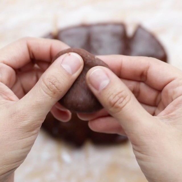 3.台の上に片栗粉を振り、(2)をのせて8等分にし、チョコレートを1個ずつ包んで丸める。