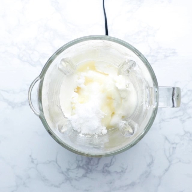 3ミキサーに.クリームチーズ、ヨーグルト、生クリーム、オレンジジュース、砂糖、ゼラチン液を加えて滑らかになるまで攪拌する。