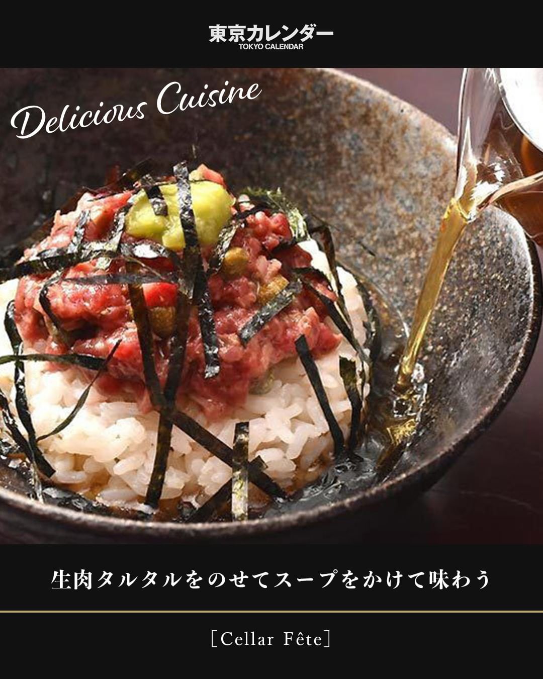 極上の牛コンソメスープは最後の一滴まで飲み干したくなる。『セラフェ』の魅力を味わい尽くし、そろそろ食事を締めくくろうというタイミングでオーダーして欲しいのは「タルタルひつまぶし」。⠀⠀⠀⠀⠀⠀⠀⠀⠀ ライスの上に、生肉タルタルをのせて、牛コンソメスープをかけて味わう『セラフェ』でしか味わい得ない極上の〆である。⠀⠀⠀⠀⠀⠀⠀⠀⠀