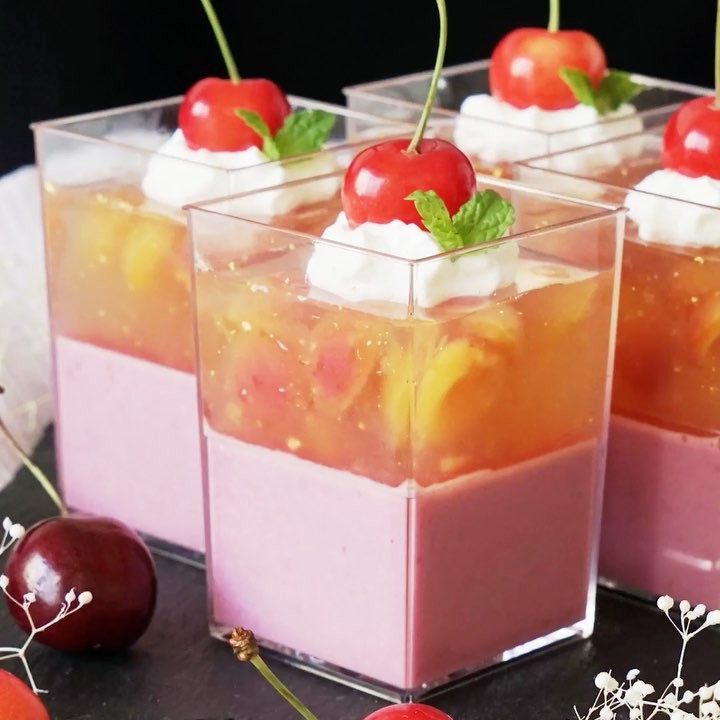 5. ミキサーにチェリームースの材料を加え、攪拌する。器の半分に流し入れ、冷蔵庫で固まるまで冷やす。⠀
