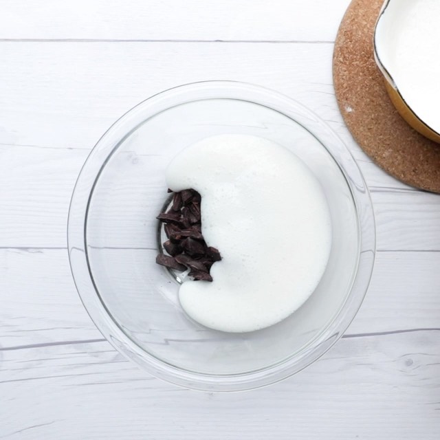 2.チョコムースを作る。鍋に牛乳を入れて火にかけ、沸騰直前まで温まったらマシュマロを加えて溶かし混ぜる。