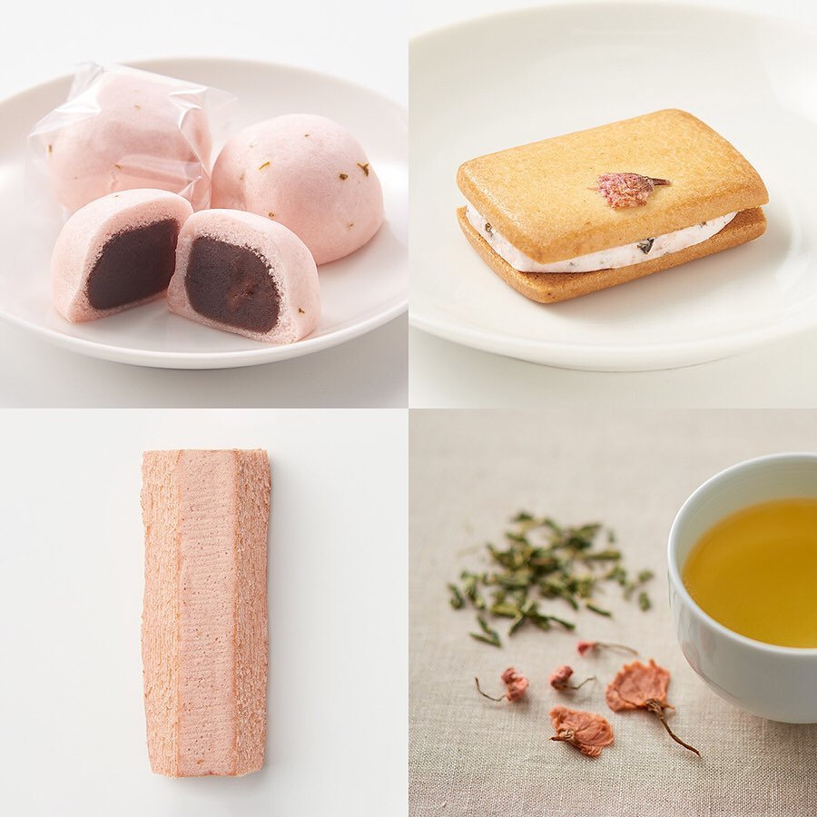 不揃いバウム、クリームサンドクッキー、まんじゅうなど、和洋のお菓子を取り揃えています。鹿児島県産のオーガニック茶葉に桜の花と葉をブレンドした「桜グリーンティー」と一緒にどうぞ。