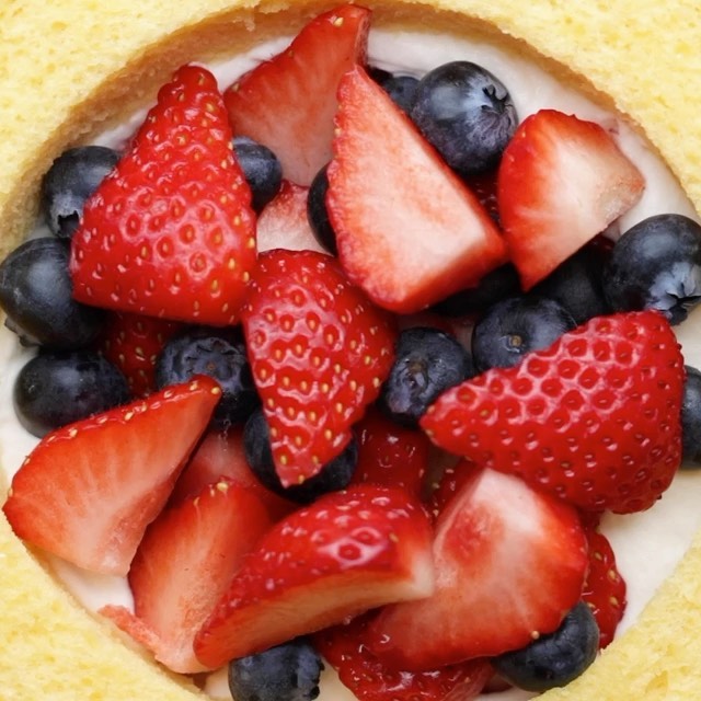 8.下の部分のスポンジケーキに(7)を塗っていちごを並べ、輪状のスポンジケーキをのせる。穴の中にいちご、ブルーベリーを詰め、縁にホイップクリームを塗っていちごをのせる。