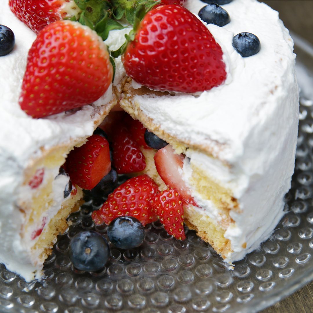 9.縁にホイップクリームを塗って残りのスポンジケーキをのせ、表面全体にホイップクリームを塗る。いちご、ブルーベリーを飾ったら、完成!