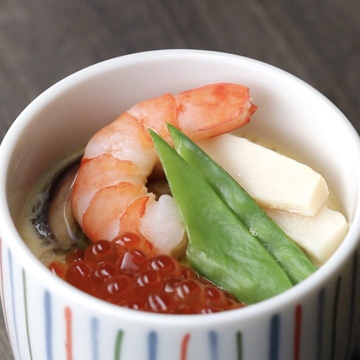 6.仕上げにボイルえび、たけのこ、きぬさや、いくらを飾ったら、完成!