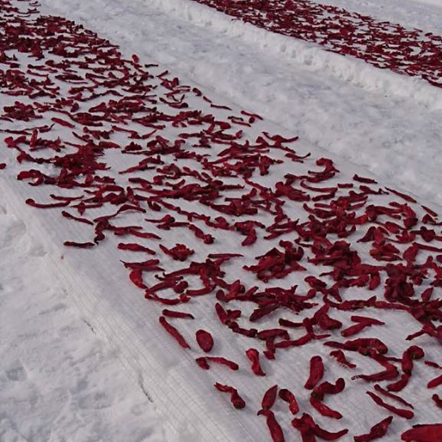 Café&Meal MUJIでは、肉厚で旨味がしっかりとある唐辛子に、糀(こうじ)と柚子、塩を加えて雪さらしの工程を経て、3年間発酵させたかんずりを使っています。雪さらしとは唐辛子を雪の上に撒いて、あく抜きを行う工程。これを行うことにより辛みが和らぎます。