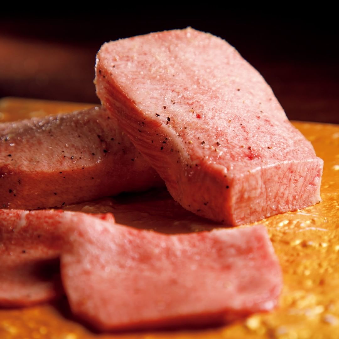 「厚切り+薄切りタン」 ¥2, 400/1人前(写真は2人前)。 今や大変希少で垂涎の的となっている黒毛和牛のタンを、 ふたつの異なる厚みで食べ比べられるとは贅沢の極み⠀⠀⠀⠀⠀⠀⠀⠀⠀