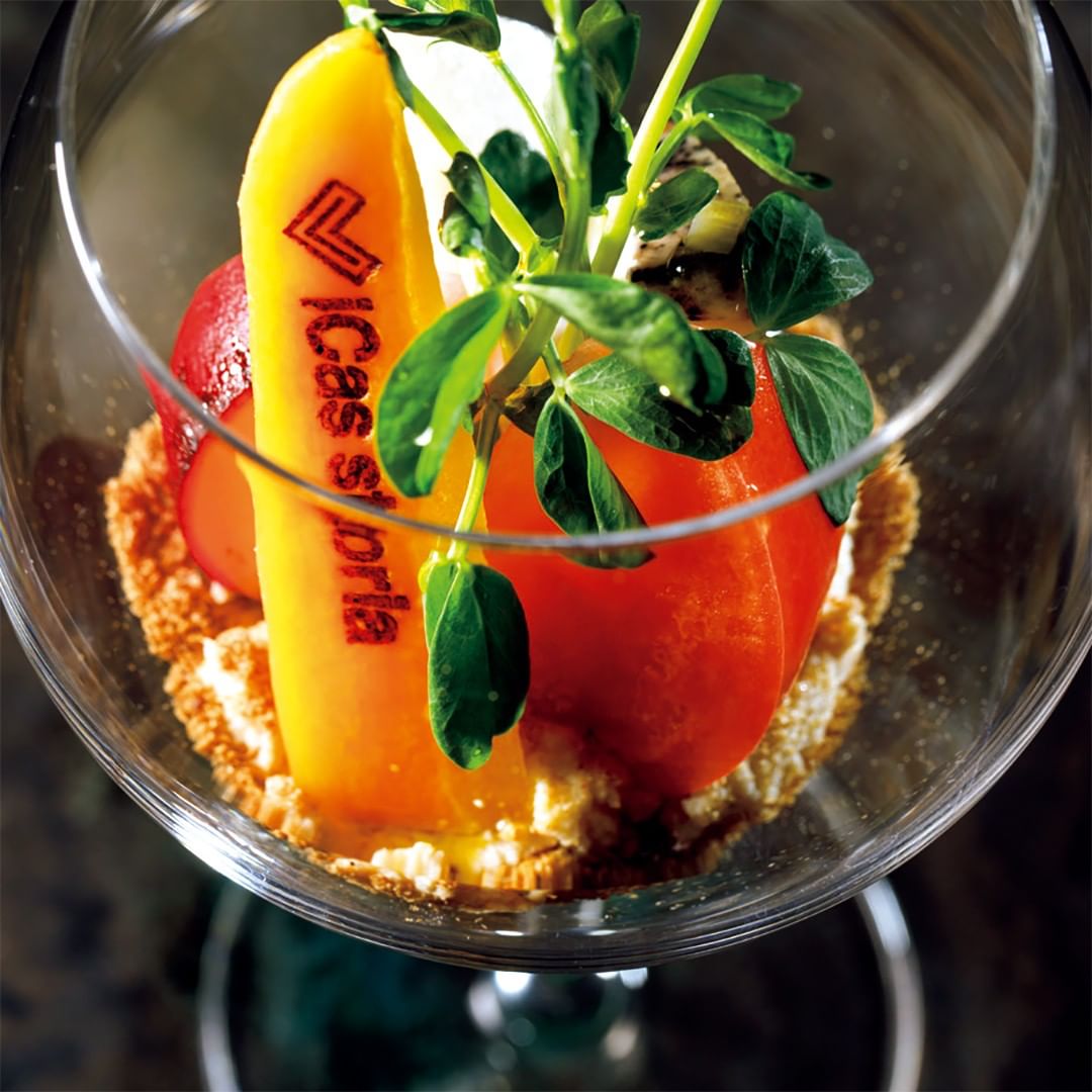「野菜のパフェ仕立て」はおからなどのソースを土に見立て、 たんじゅん野菜が生えた畑をイメージした。 その場でチーズを粉雪のようにかけ、 ディップしながら食べる。⠀⠀⠀⠀⠀⠀⠀⠀⠀