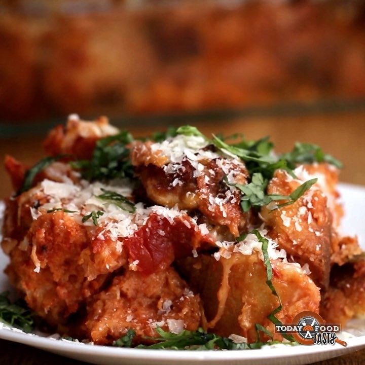4. ミートボールを並べて、残りのマリナラソースとモッツァレラチーズをかける。