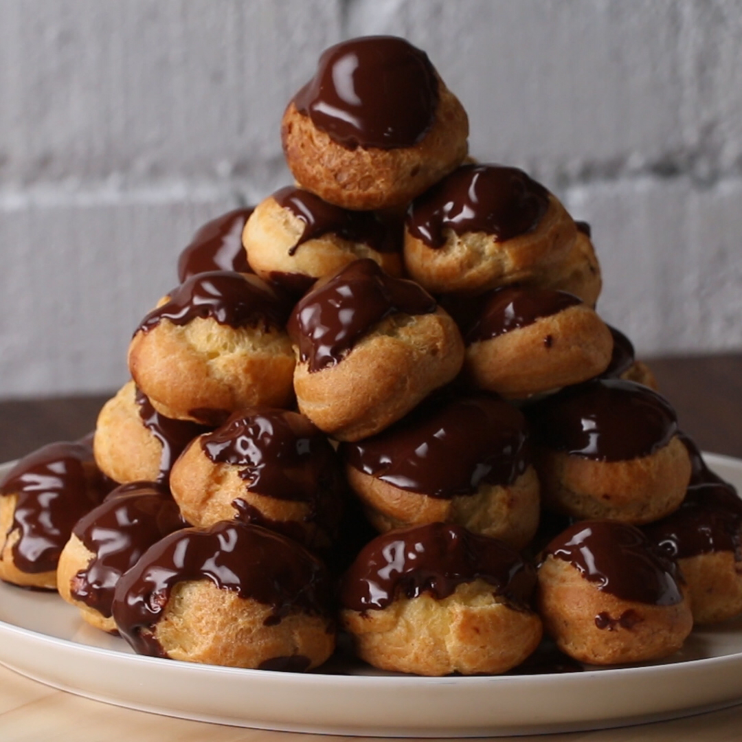 9. クリームとわさびをつめたシューを溶かしたチョコレートにくぐらせ、タワーを作ったら、完成!誰がわさびシューを選ぶか、お楽しみ!