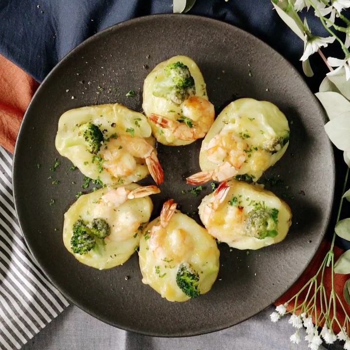 3. 1のじゃがいもの器に2を入れ、エビとブロッコリー、とろけるチーズをのせてオーブントースターで3分ほど焼く。 ⠀