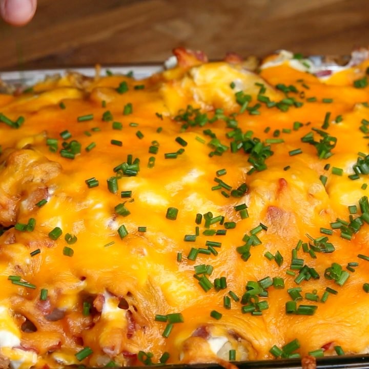 5. 耐熱容器に(3)の半量をしきつめ、ベーコン、サワークリーム、チェダーチーズをそれぞれ半量ずつ重ねる。これを2回繰り返す。