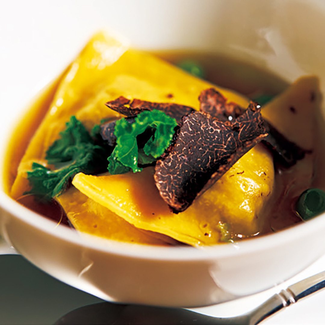 鹿のコンソメに浮かぶラビオリの中には鹿とフォアグラ、黒トリュフ入り。