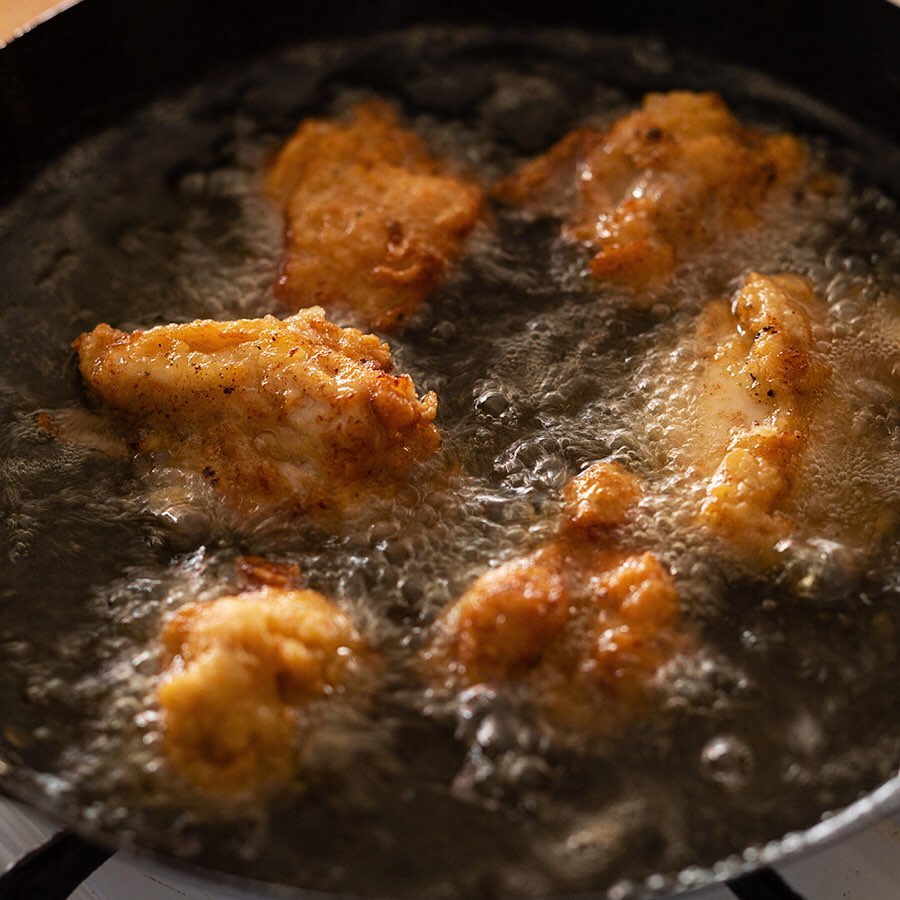 4)160℃の油で3分揚げて一度取り出し、180℃に温度を上げて更に1分半揚げます。