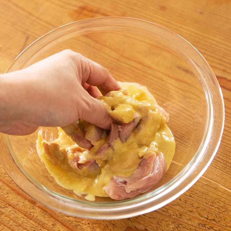 2)ボウルに1と「素材を生かした シチリアレモンのクリーミーチキンカレー」を半分入れて揉み込み、冷蔵庫に入れて15分おきます。