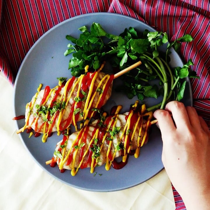 6. 焼きあがったらケチャップとマスタードをかけて召し上がれ!⠀