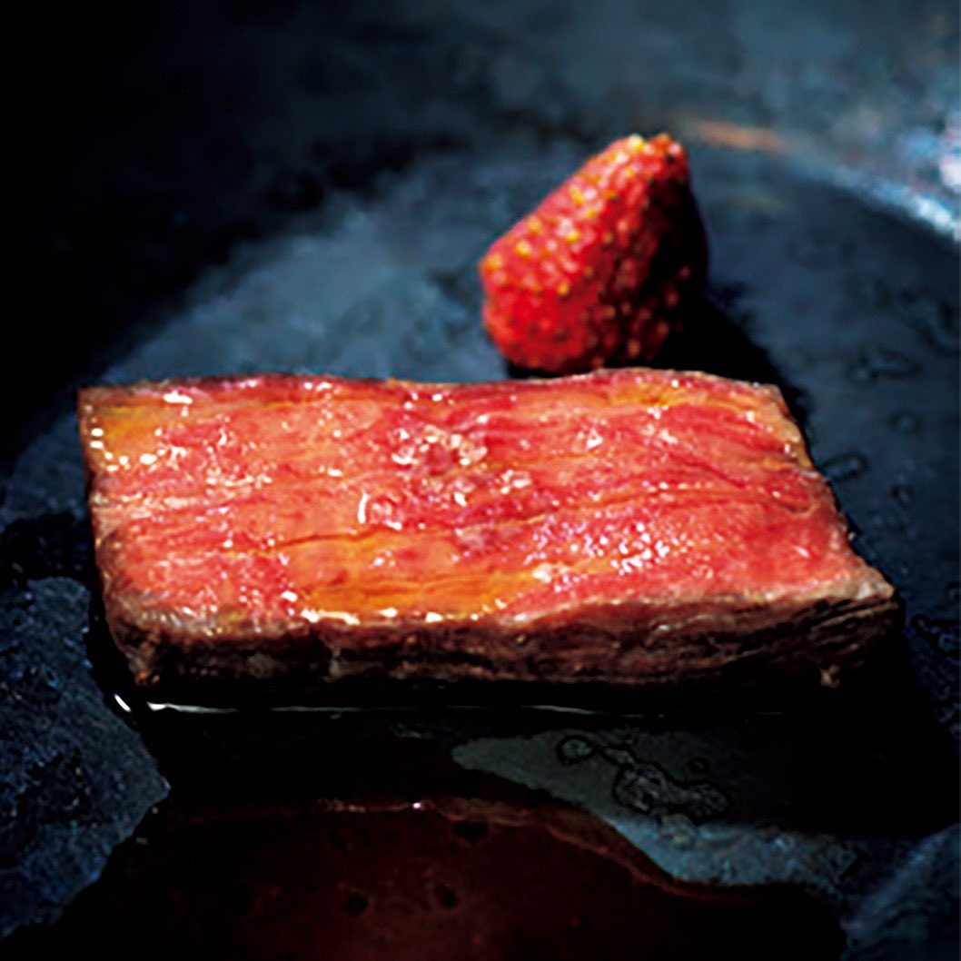 写真②「常陸牛の薪焼き」は、薪で香りづけされたステーキ。