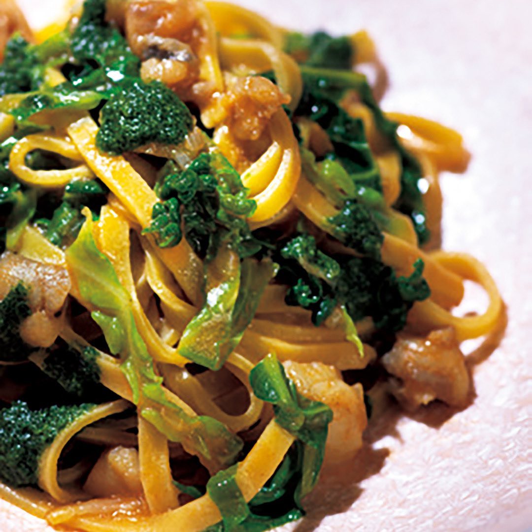 「アンコウのタリアテッレ」は、魚介の香りと旨みが、卵の入ったタリアテッレと出合った濃厚なパスタ。