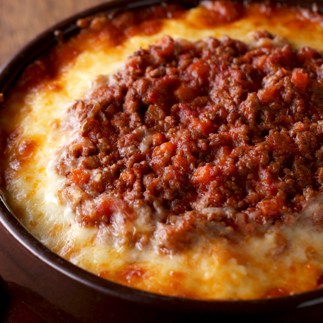 6. グラタン皿にターメリックライスを平たくしきつめ、ホワイトソースを全体に薄くのばし、中央にミートソースをのせる。ホワイトソースの上にピザ用チーズを散らし、220℃のオーブンで20分焼き色がつくまで焼いたら、完成!