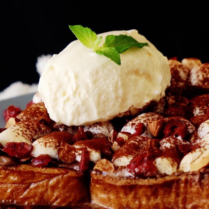 5.焼きあがったらココアを振り、バニラアイスとミントをトッピングして完成!