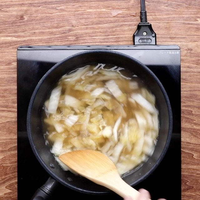 2.沸騰したら弱火にし、白菜がしんなりするまで5分ほど煮る。