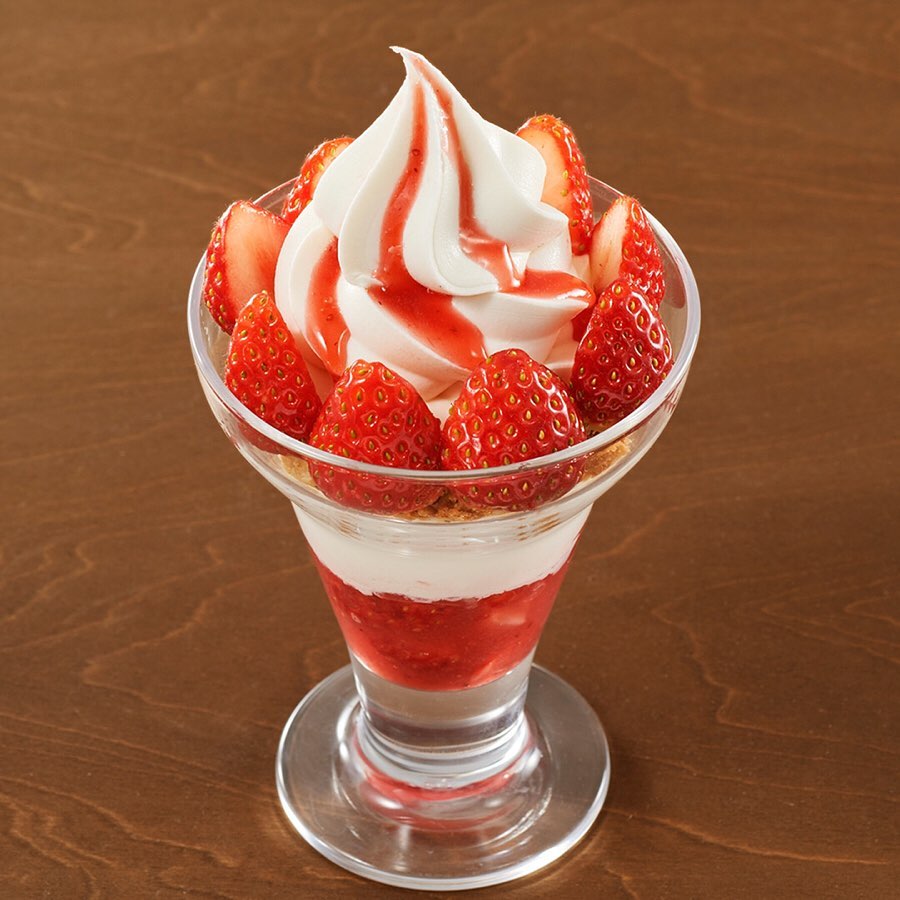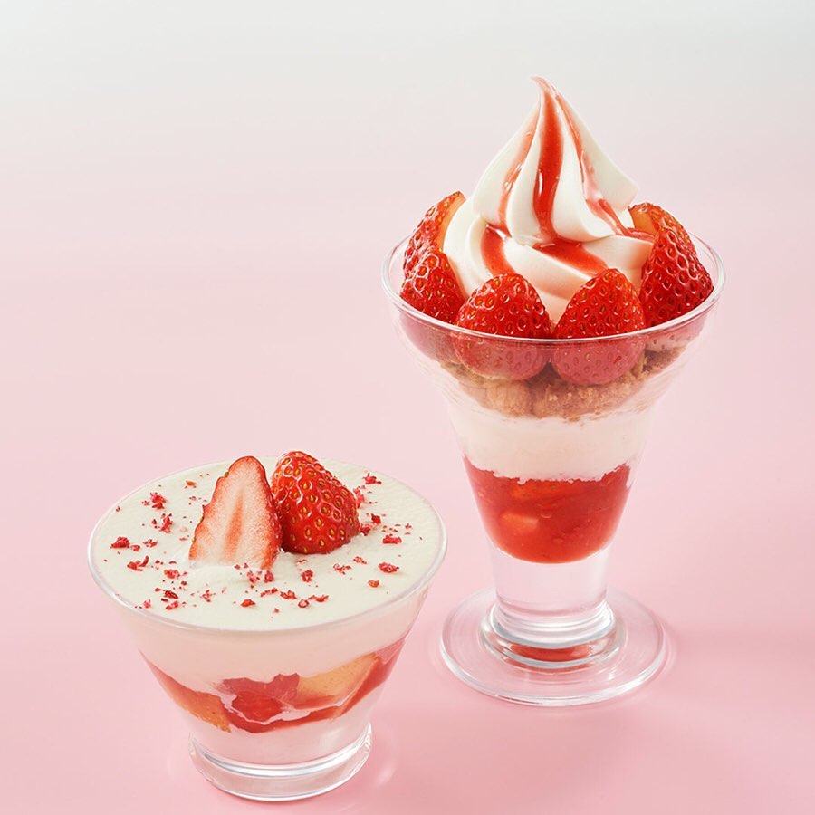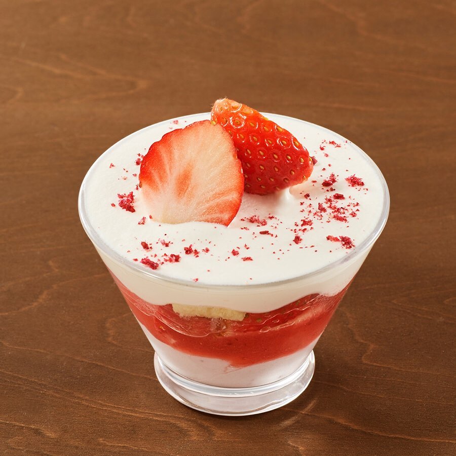 手づくり苺ソースやクランブル、クリームチーズを合わせた甘酸っぱい苺のパフェや、濃厚なホワイトチョコクリーム、バターケーキ、苺ソースなどを合わせて苺をトッピングした、グラスに入った苺ショート。