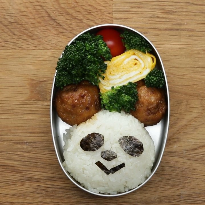 4.パンダおにぎりを作る。手に水と塩をつけ、ご飯の真ん中に(3)のミートボールを入れ、丸く握る。おにぎりを弁当箱の中に入れ、パンダの耳に当たる部分にミートボールを入れる。海苔をパンダの顔になるように切り抜いて貼り付け、お好みのお弁当のおかずを詰めたら、完成!