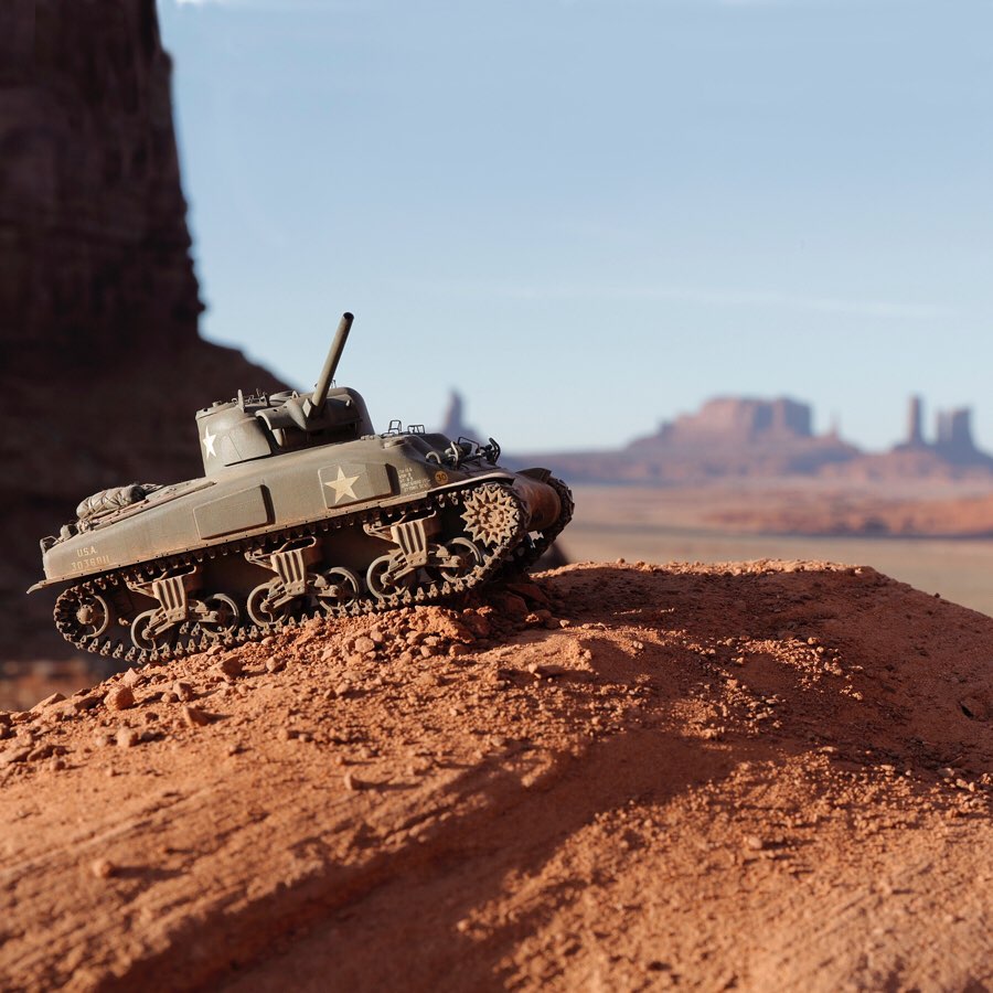 Inspiration: The inspiration for this shoot was a teensy model tank built by a friend. The instant I saw it I knew I had to use it as a “Hanging Miniature”; a forced-perspective, in-camera, special effect technique widely used in pre-digital Hollywood.