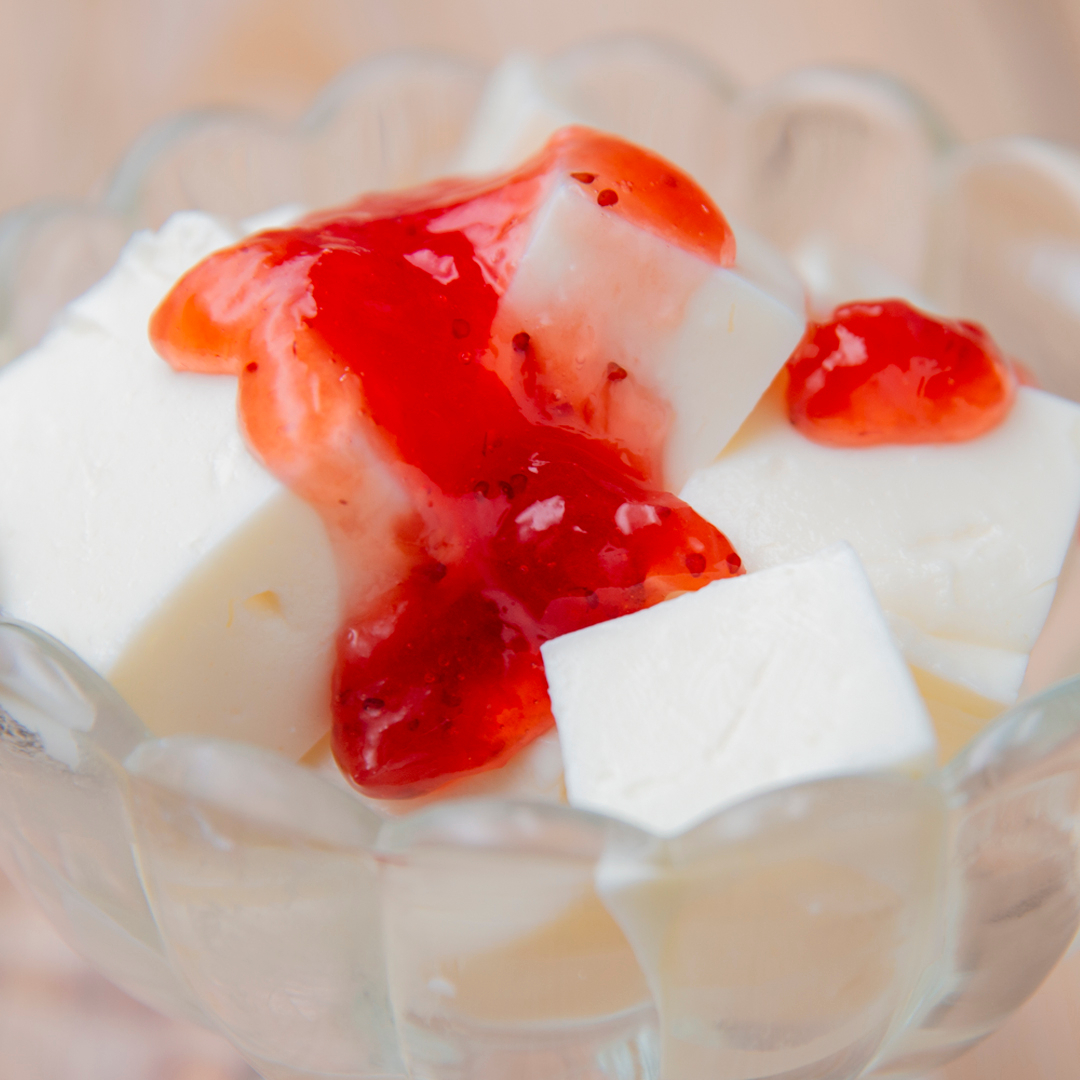 6.紙パックからチーズケーキを取り出し、お好みでいちごジャムを添えたら、完成!