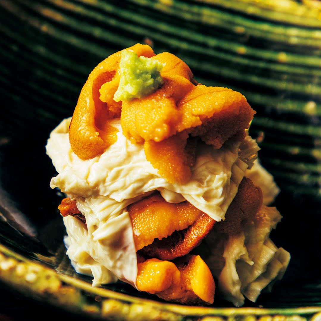 写真①「生湯葉と雲丹のミルフィーユ」¥1,600。
