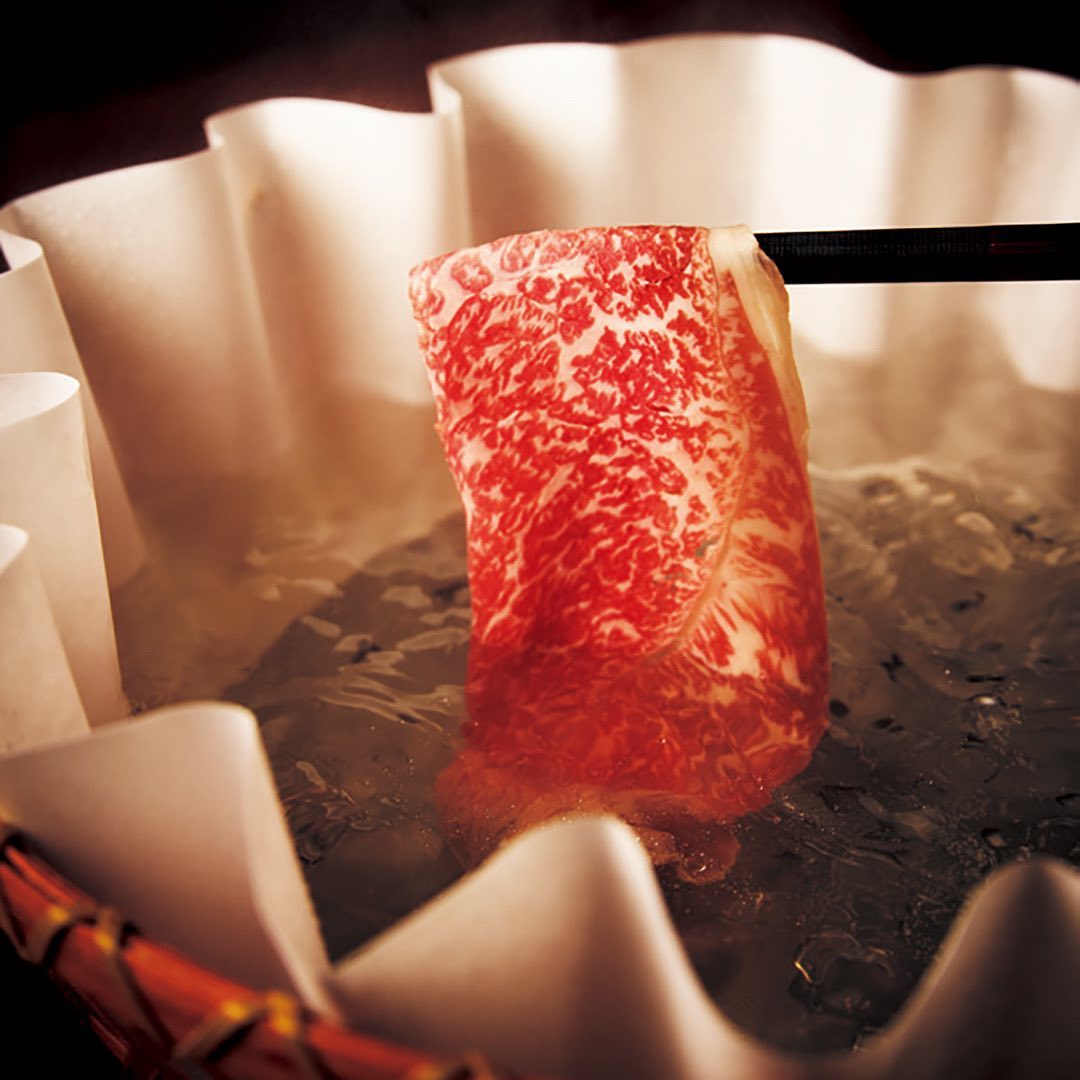 昆布が入った紙鍋に牛をさっとくぐらせ、ほんのりピンクに色づいたくらいが食べ頃。