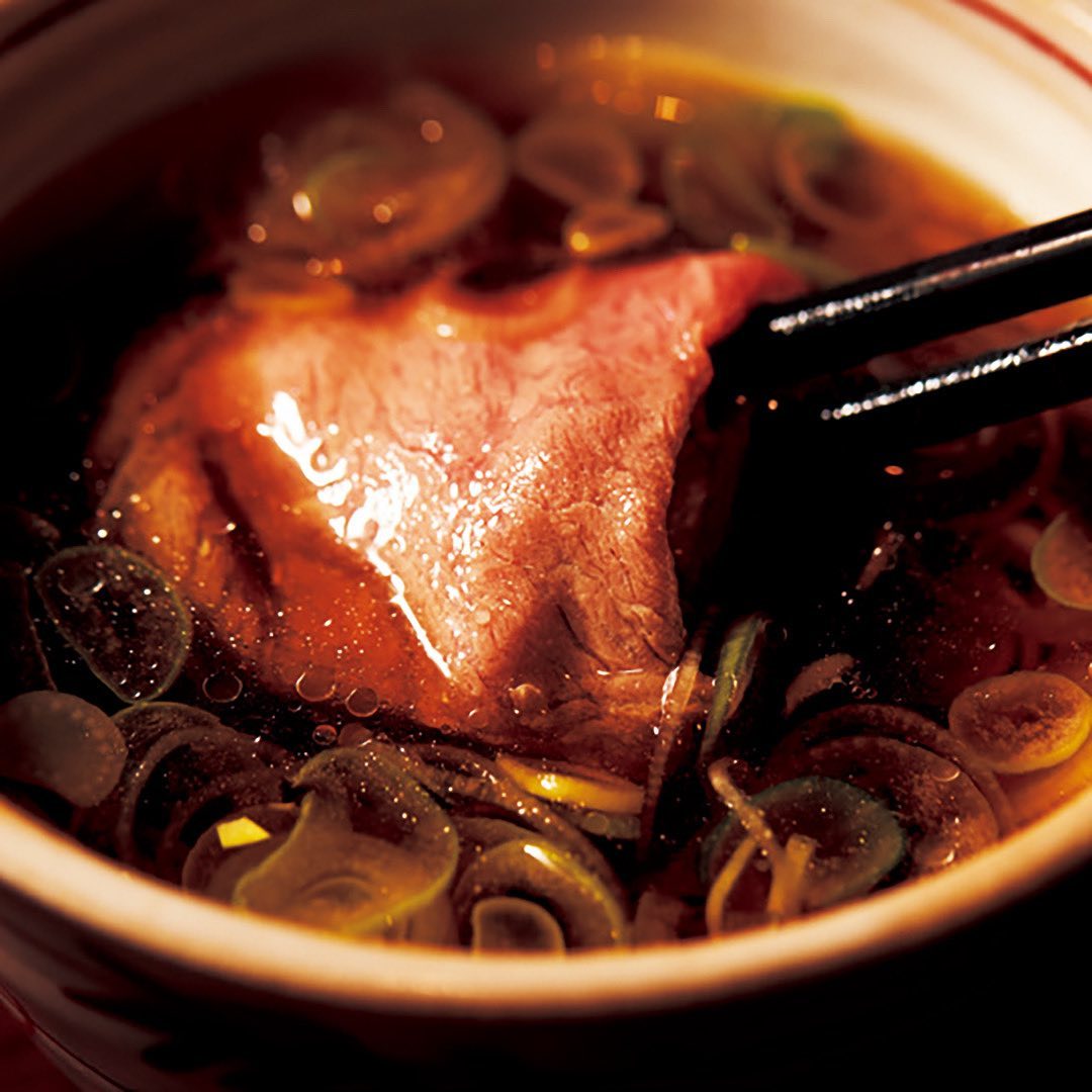 かつお節と昆布、にぼしの一番出汁を2回取り、かえしを合わせた風味豊かな出汁が牛の旨みを引き立てる。