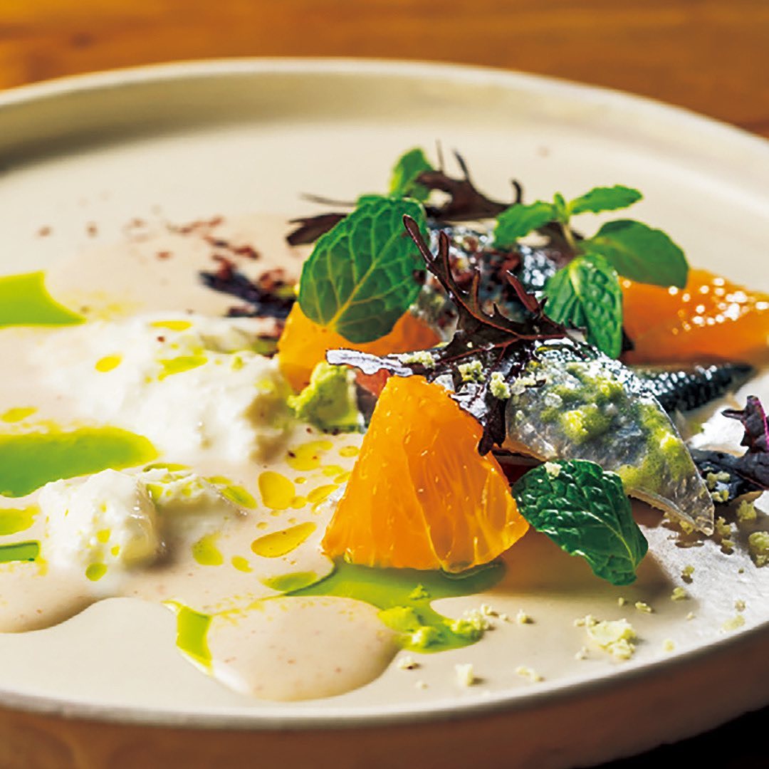 ①「真イワシのマリネ アホブランコ」。季節のフルーツと魚のマリネは店の定番。ソースはアンダルシアの郷土料理をベースに。
