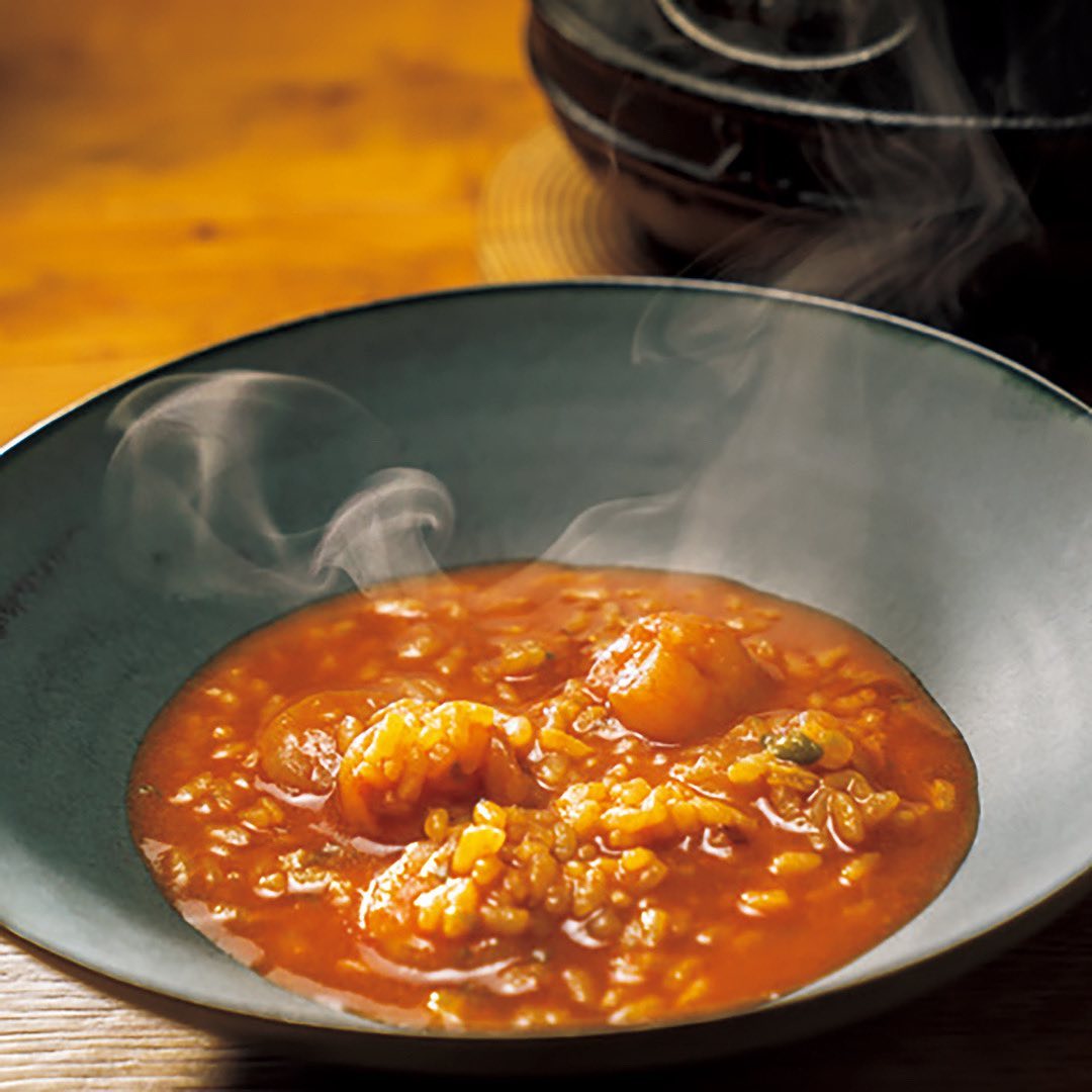 ③クラシックな米料理「アロスメロッソ」は、身体に沁る滋味深い味わい。21時まではコース¥5,000~のみ