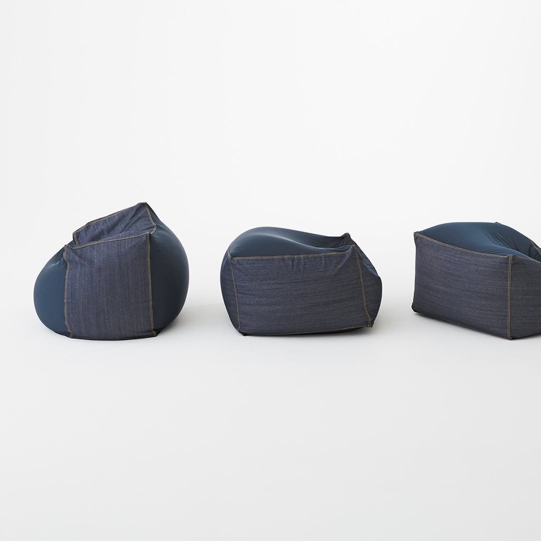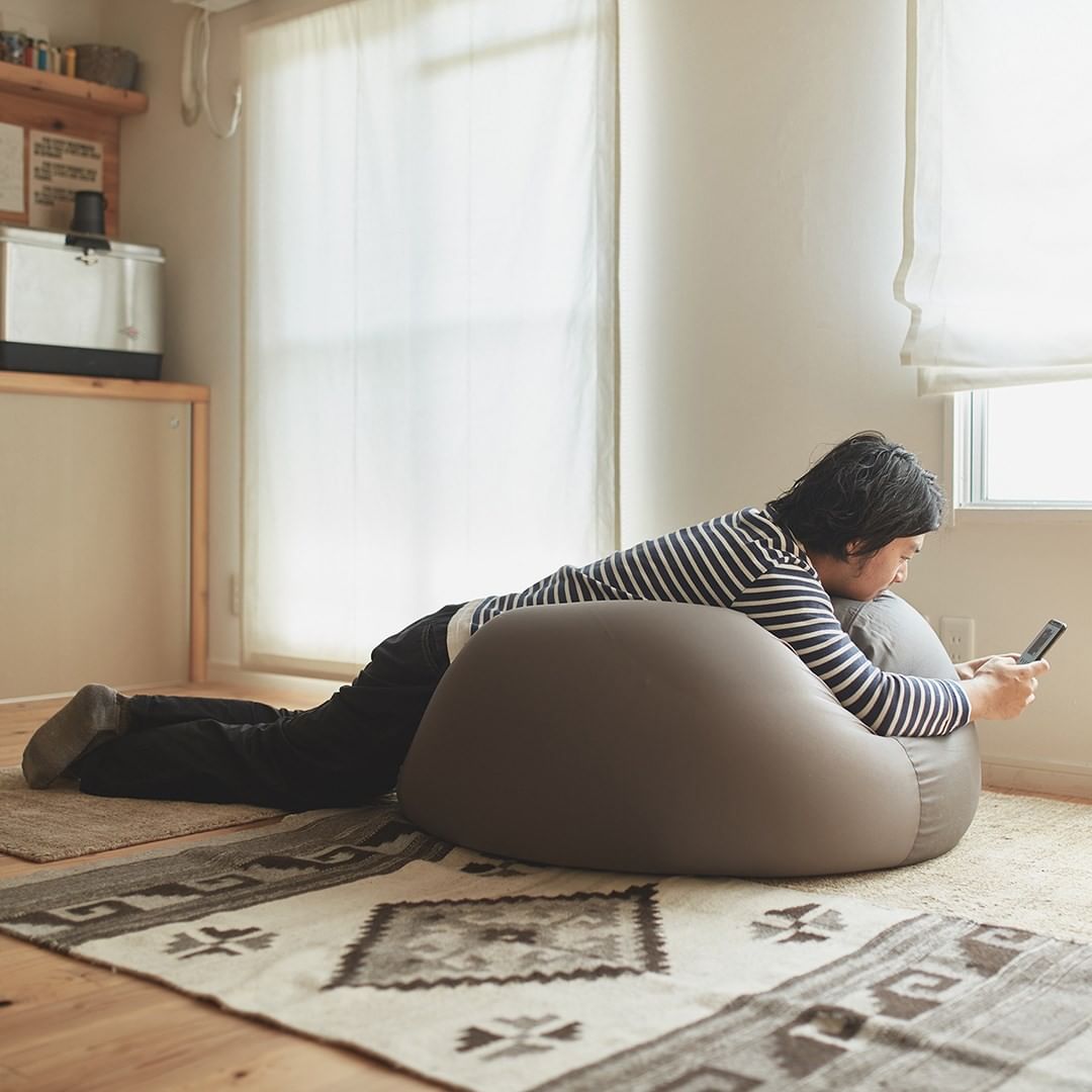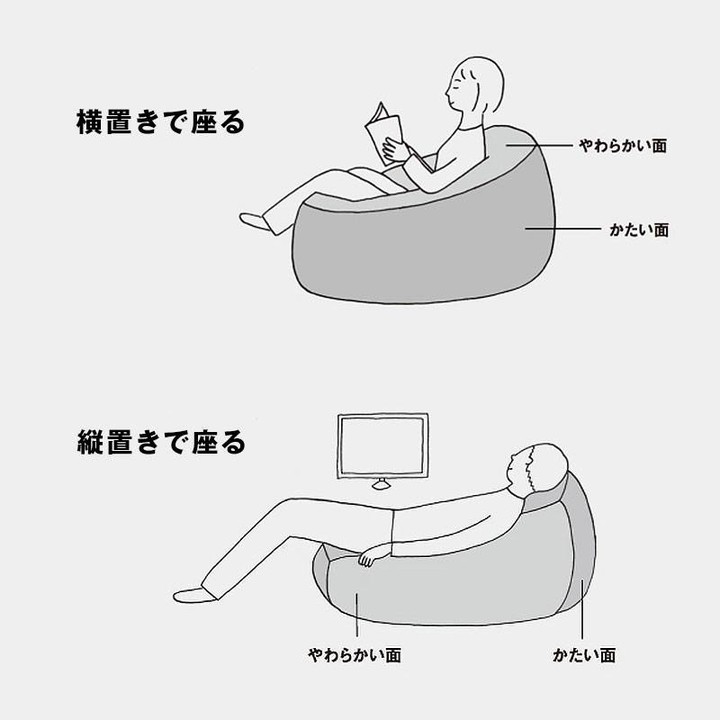 自由に変形する『体にフィットするソファ』は、横置きで座れば、からだを包み込んでしっかりと姿勢を保ち、縦置きで座れば、円状にひろがった座面に全身をあずけられます。