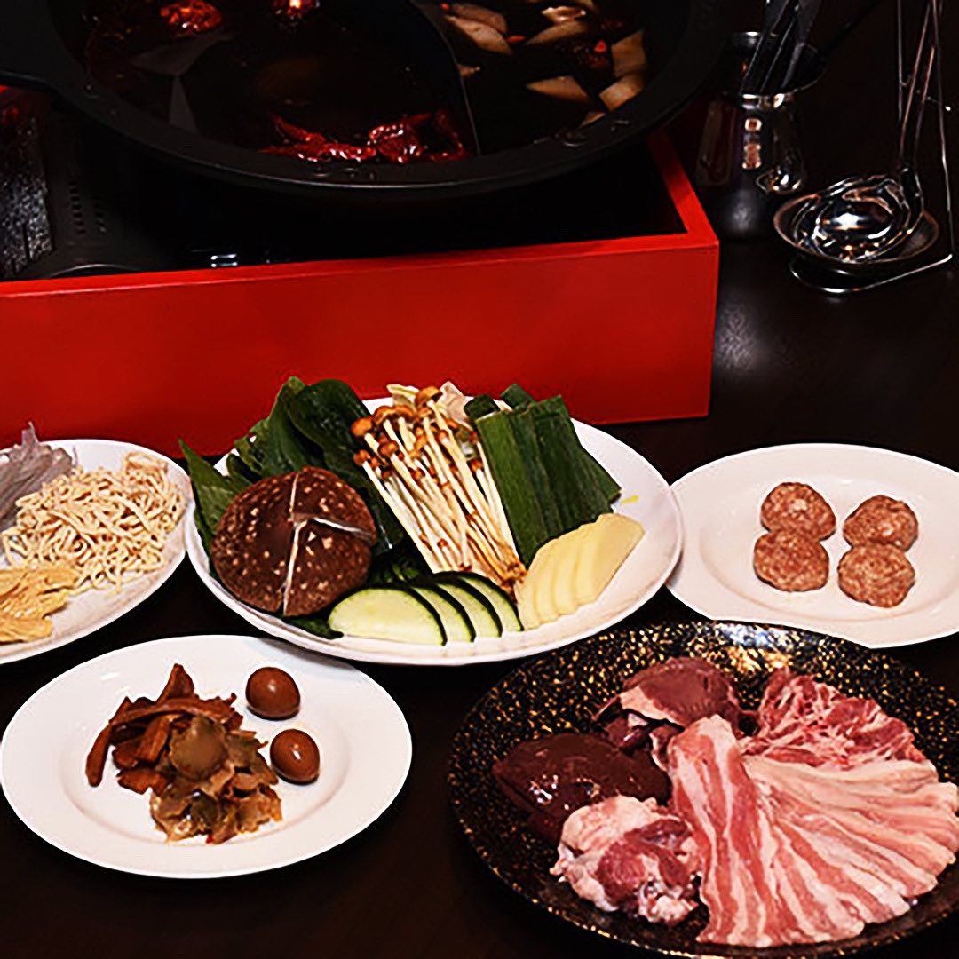 【テイクアウトメニュー】 ✓特製火鍋セット ¥3,500(2人前・税込) ≪内容≫加藤ポーク盛り合わせ、もも肉、バラ肉、肩肉など400g/大人気フワフワ肉団6粒/新鮮野菜10種盛り合わせ/スープは「美肌薬膳スープ」か「旨辛麻辣スープ」の2種類から選択可能/その他オプションもあります。