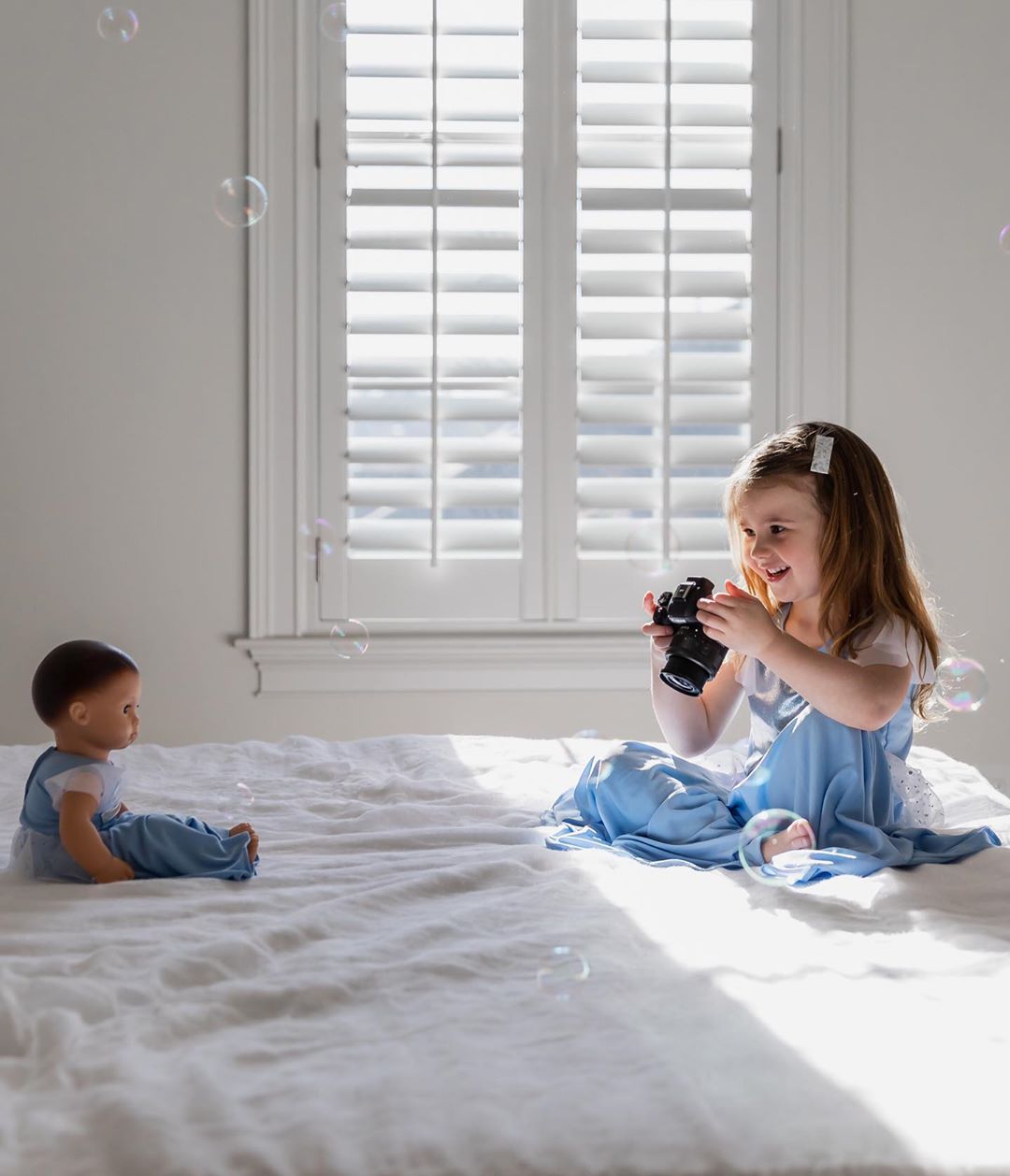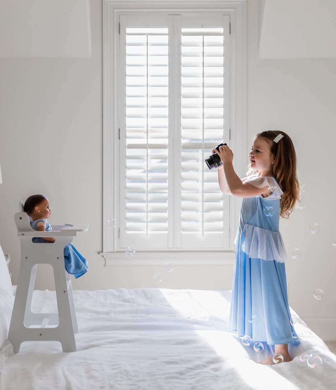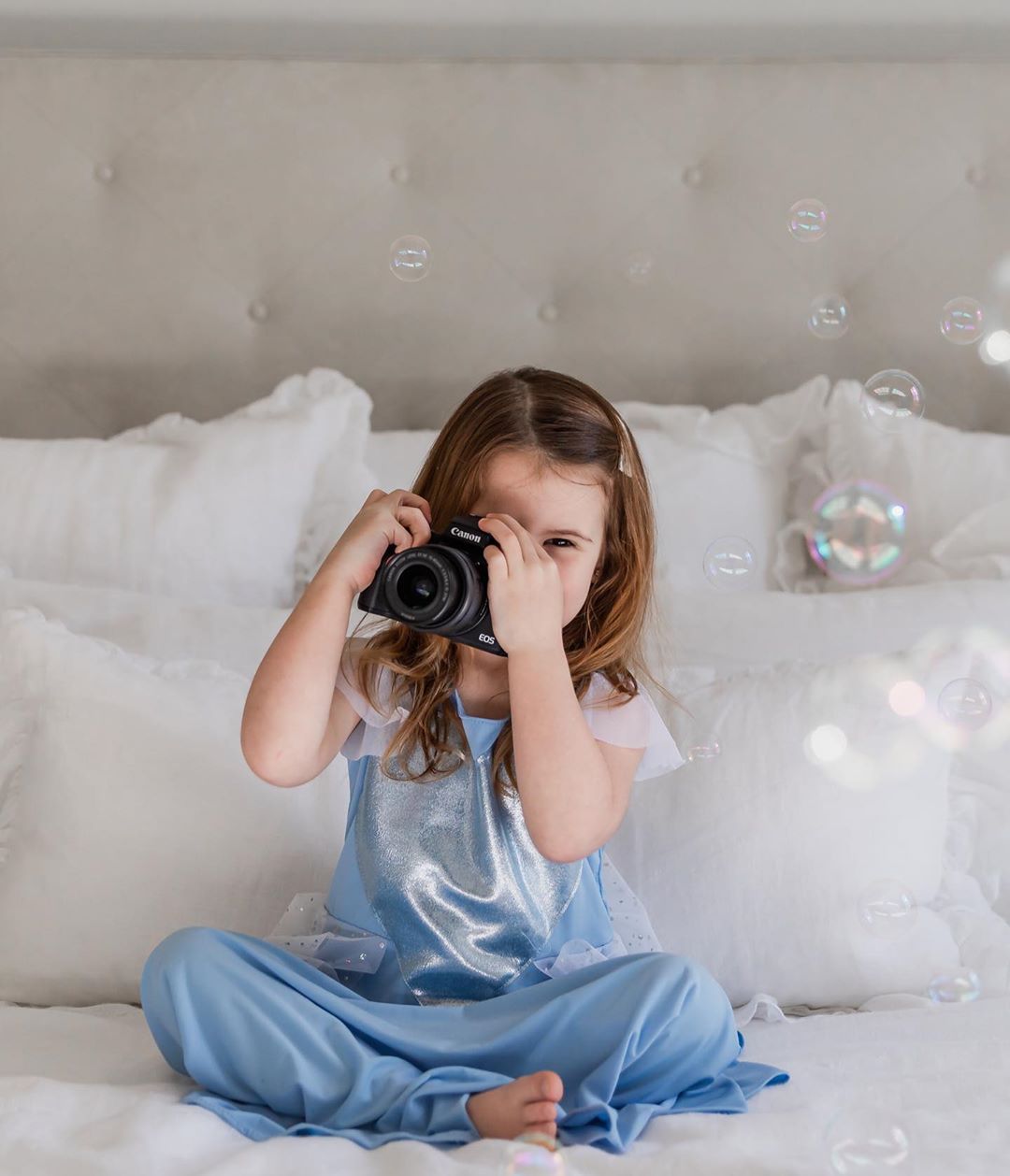TIP#1 – Toddlers like to feel like they are in control so I let her set up her own shoot! She chose the outfits, the high chair prop, and the bubbles! I just directed her to the pretty light✨ TIP #2 – Do not put your camera in a compromising position … Notice I let her do this on a bed so if she dropped the camera it was okay! TIP #3 – Have FUN! Make memories together, foster creativity, build confidence in your little one by letting them take the reins!” – @taraherron_photography