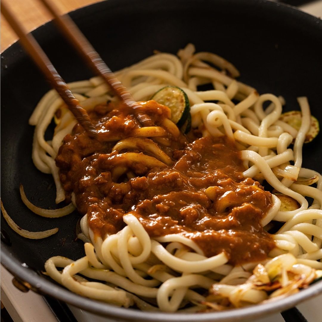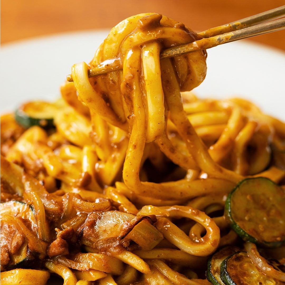 味付けはキーマカレーにおまかせの、家でも簡単につくれる焼きカレーうどんです。