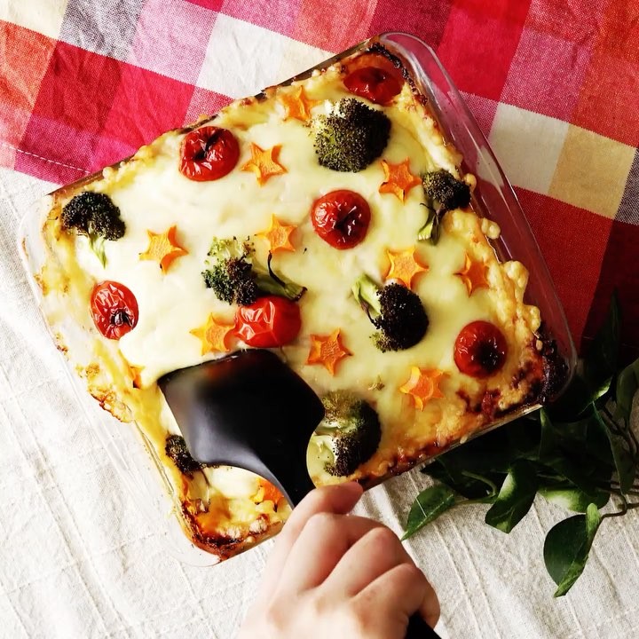 4.チーズ、食べやすい大きさに切ったブロッコリー、1/2の大きさに切ったトマト、星形に切り抜いた人参をのせ、250℃のオーブンで30分焼く。⠀