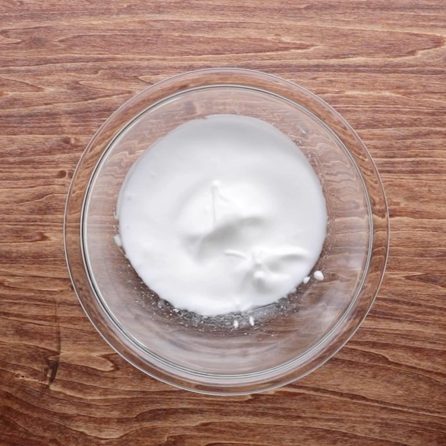 4.スポンジ生地を作る。卵は卵黄と卵白に分け、卵白に砂糖を加え、ハンドミキサーでツノが立つまで泡立てる。